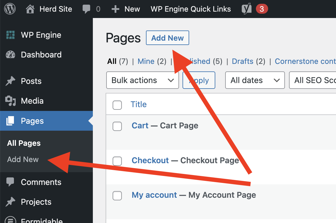 Editing pages – There are 2 main ways to edit a page. Either navigate to the page within the backend of WordPress (and click on the page title) OR when logged in go to the page on the front of the website and enable the visual builder.